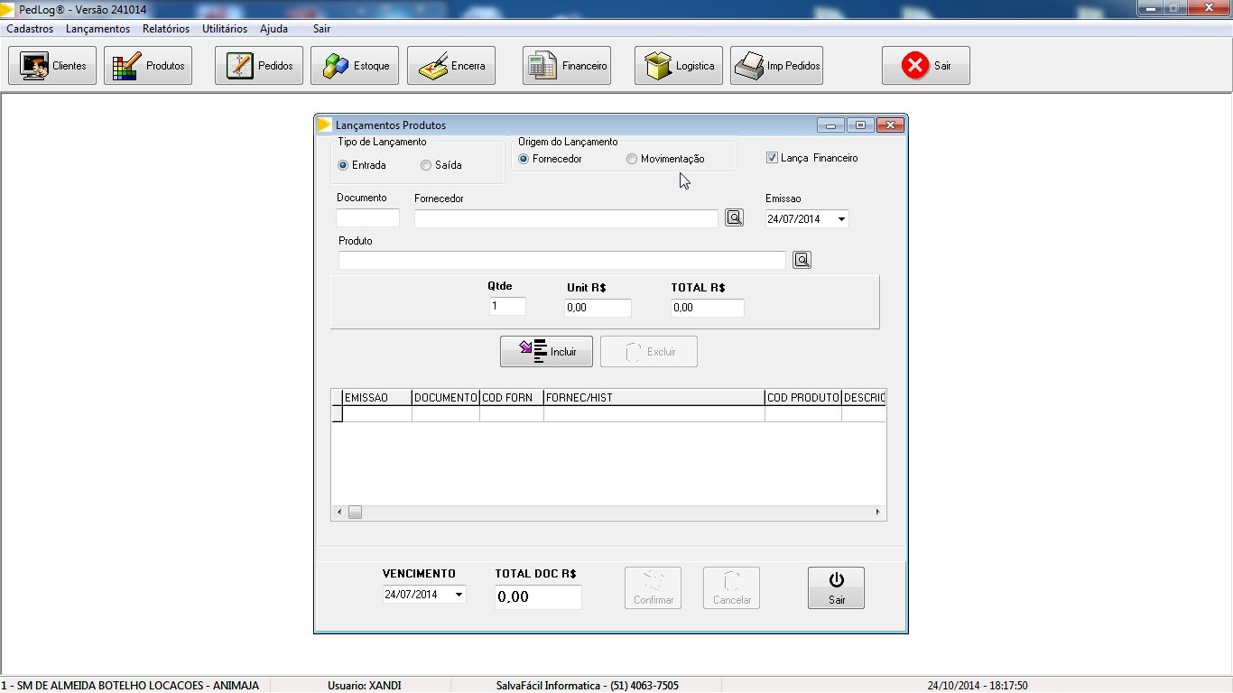 Tela de Lançamento de produtos permite lançamento de entrada e saída por notas ou por movimentação de acerto de estoque, faz lançamento no financeiro.